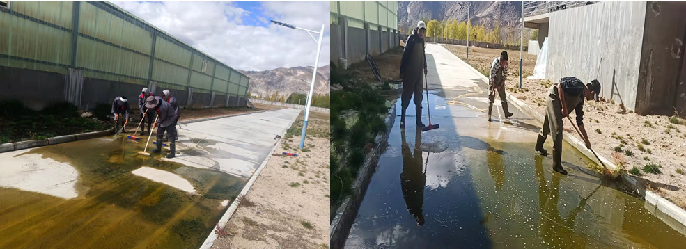 (清理廠區(qū)道路上的灰沙河青苔的照片)